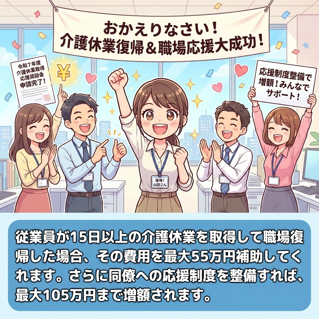 最大55万円の奨励金が支給されます。さらに職場の応援体制を整えれば、最大105万円まで増額されます。